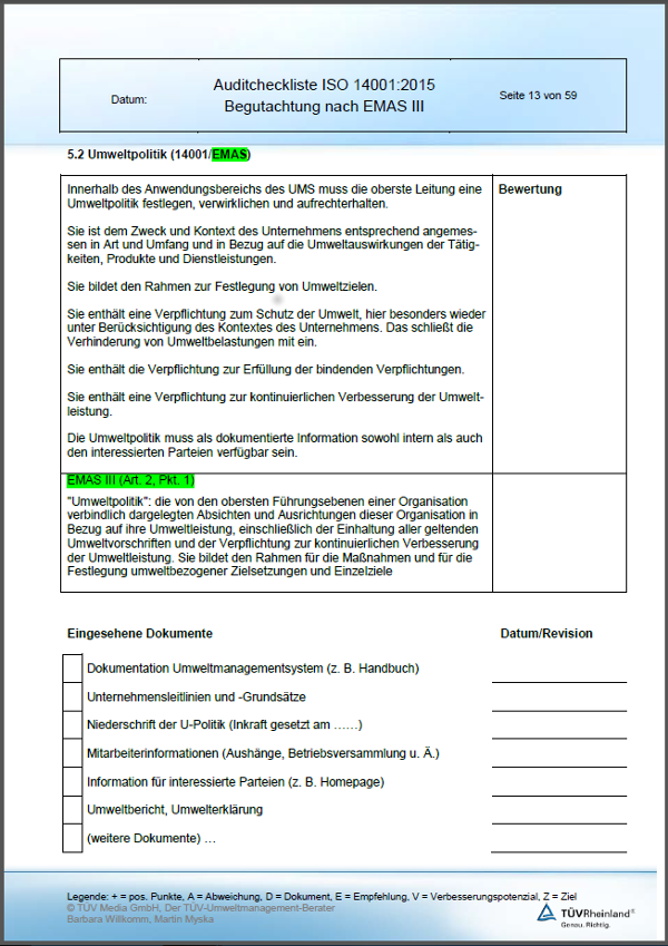Die Frageliste korrespondiert mit der ISO 14001:2015 sowie mit EMAS III. Die EMAS-III-spezifischen Fragestellungen, die für eine Zertifizierung nach ISO 14001 nicht relevant sind, sind in der Liste entsprechend gekennzeichnet und können bei Bedarf einfach gestrichen werden.[