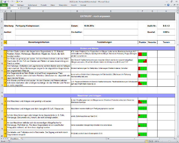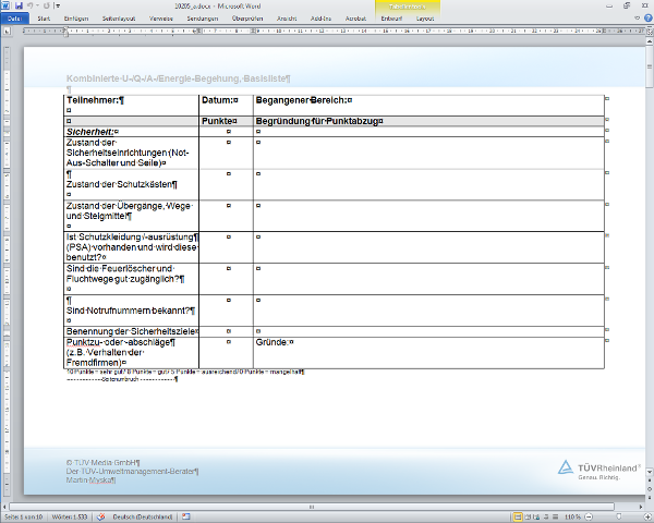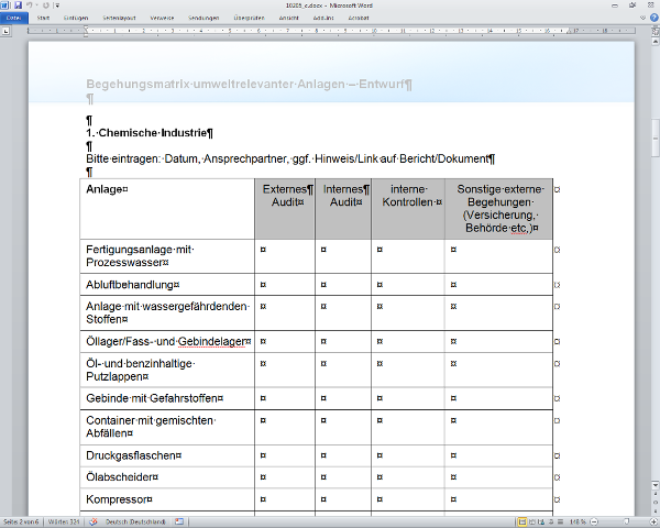Neben den umfangreichen Audit-Checklisten auf Normenbasis (9001, 14001, 18001 ...) bieten sich für Begehungen abgespeckte, auf spezielle Teilbereiche oder Themen zugeschnittene Checklisten an. In den zu diesem Beitrag gehörenden Arbeitshilfen werden Muster für verschiedene bewährte Vorlagentypen zur Dokumentation von Begehungen vorgestellt. Die Inhalte der verschiedenen Checklisten sind beispielhaft gewählt und für verschiedene Anlässe vorgesehen. Sie können dem Anlass entsprechend eine Vorlage auswählen, müssen aber die Prüfpunkte auf die eigenen betrieblichen Anforderungen ergänzen und anpassen.