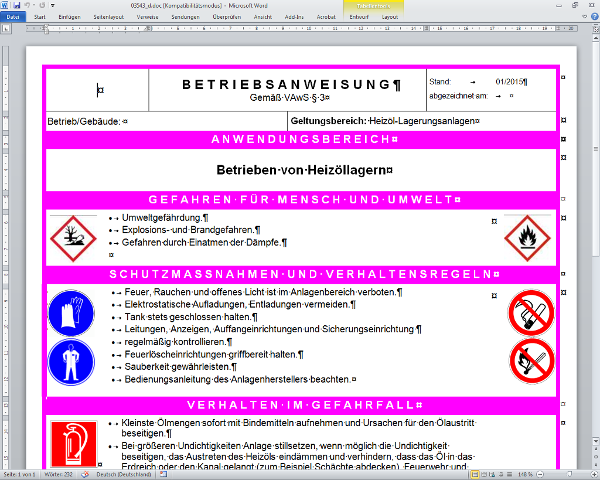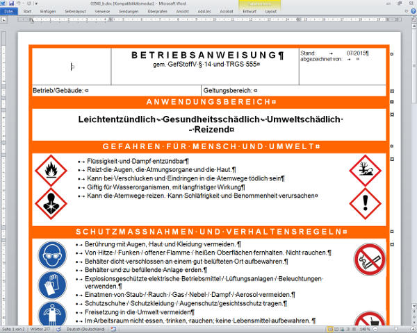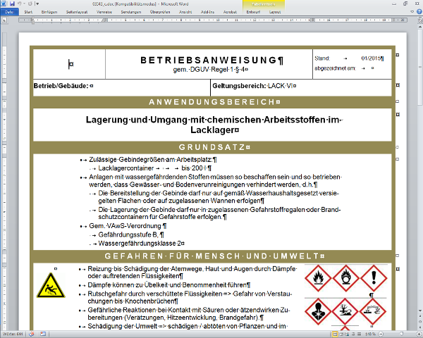 Nach § 14 der Gefahrstoffverordnung vom 16. November 2010 hat der Arbeitgeber sicherzustellen, dass den Beschäftigten eine schriftliche Betriebsanweisung, die der Gefährdungsbeurteilung nach § 6 Rechnung trägt, in einer für die Beschäftigten verständlichen Form und Sprache zugänglich gemacht wird. Betriebsanweisungen sind auch in anderen Rechtsvorschriften, z. B. der Unfallversicherungsträger oder des Wasserrechts, vorgeschrieben. Arbeitshilfen: von: |