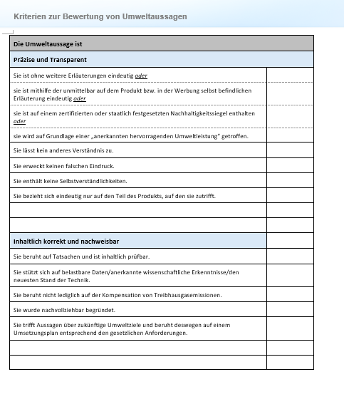 Antwort: Unternehmen sollten ihre bestehenden Umweltaussagen und Nachhaltigkeitssiegel systematisch überprüfen. Aussagen müssen insbesondere klar, konkret und eindeutig formuliert sein, dürfen keine Selbstverständlichkeiten enthalten und müssen auf belastbaren Daten beruhen. Eine Checkliste kann dabei helfen, die Konformität zu prüfen. | |