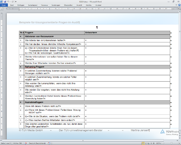 Unsere Audits sind häufig geprägt von einem hohen Maß an Routine. Dies birgt jedoch die Gefahr, Potenziale brach liegen zu lassen, indem Audits die immer gleichen Ziele verfolgen und die immer gleichen Fragen verwenden. Dieser Beitrag zeigt die Wichtigkeit und vor allen Dingen die Möglichkeit auf, „frischen Wind” in die internen und externen Audits zu bringen. Basierend auf Erkenntnissen der lösungsorientierten Beratung geht es um andere Sichtweisen und um „die etwas andere Auditfrage”. Darüber hinaus soll eine Beispielliste Impulse für den Einsatz dieser Fragen im eigenen Betrieb geben. Arbeitshilfen: von: |