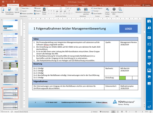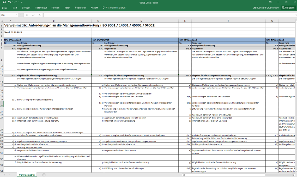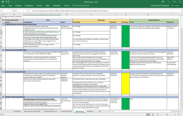 Im Kern dieses Beitrags erfahren Sie, wie Sie bei einem integrierten System aus ISO 9001, ISO 14001, ISO 45001 und ISO 50001 eine normenkonforme und trotzdem übersichtliche Managementbewertung durchführen können, was Inhalt der dokumentierten Bewertung sein muss und was ggf. in andere begleitende Dokumente (Anlagen) ausgelagert werden kann.
