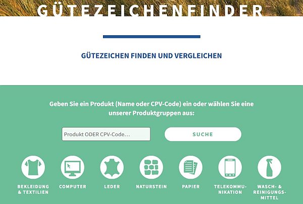 Um das Analyseinstrument so praxisnah wie möglich zu gestalten, wurde der Gütezeichenfinder gemeinsam mit Beschaffungsverantwortlichen entwickelt. Die größte Informationsvielfalt finden Sie zunächst in der Produktgruppe Bekleidung & Textilien. Daneben gibt es noch Informationen zu den Produktgruppen Leder & Lederprodukte, Mobiltelefone, Computer, Naturstein, Papier sowie Wasch- & Reinigungsmittel.