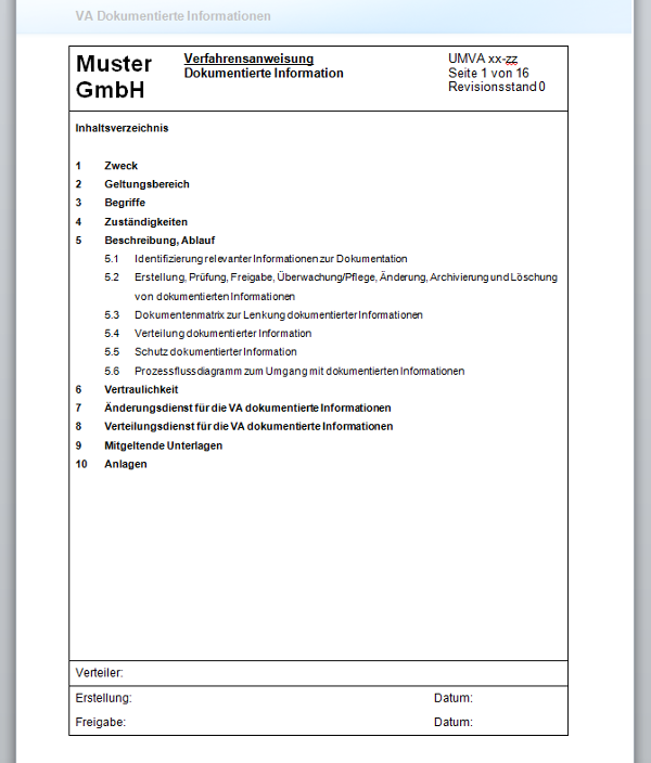 Für die effektive und reibungslose Organisation des betrieblichen Umweltschutzes ist ein gewisser Formalismus bei der Lenkung von Prozessbeschreibungen, Dokumenten und Aufzeichnungen notwendig. Es muss sichergestellt werden, dass umweltrelevante Informationen auf dem gültigen Stand, für die Verwendung geeignet und dort dann verfügbar sind, wo und wann sie gebraucht werden. Dabei sollte das Hauptaugenmerk allerdings immer auf der wirkungsvollen Umsetzung des Umweltmanagementsystems und nicht auf einem aufwendigen Dokumentenlenkungssystem liegen. Eine „VA dokumentierte Informationen” bietet vor diesem Hintergrund eine Möglichkeit, den Umgang mit dokumentierten Informationen präzise festzulegen.