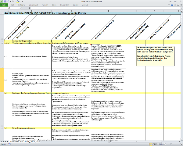 In der als Arbeitshilfe angehängten Auditcheckliste wird die ISO 14001 geordnet nach den Normkapiteln (Spalte 1) mit ihren einzelnen Normforderungen (Spalte 2) dargestellt, anschließend werden diese dann erläutert. Fragen zur Selbsteinschätzung helfen dabei, den Status quo des eigenen Unternehmens zu ermitteln (Spalte 3). In der Spalte 4 „Umsetzung in die Praxis” schließlich finden Sie Tipps und Hinweise, die sich in der Praxis als sehr hilfreich erwiesen haben.[