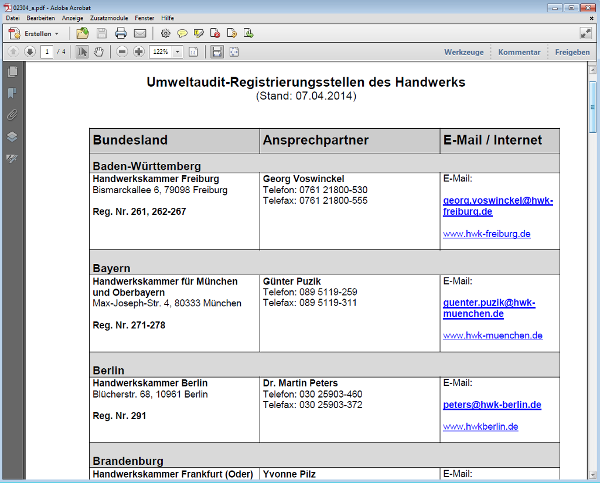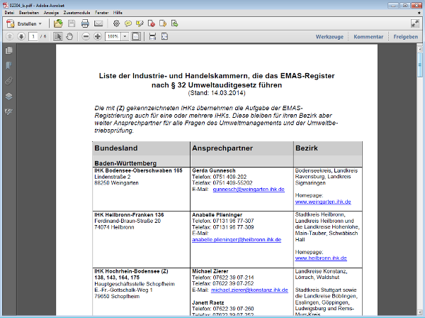 In Deutschland wurde bei der Umsetzung der EMAS bzgl. der Registrierung der Standorte ein dezentraler Ansatz gewählt. Gemäß § 32 Abs. 1 UAG ist die Zuständigkeit für die Eintragung der an dem System teilnehmenden Standorte bzw. Organisationen, insbesondere die in den Artikeln 5 bis 7 der Verordnung (EG) Nr. 761/2001 festgelegten Aufgaben, den Industrie- und Handelskammern sowie den Handwerkskammern übertragen worden. In den Anhängen finden Sie Anschriften, Ansprechpartner und Kontaktdaten für die einzelnen Bundesländer. Arbeitshilfen: von: |