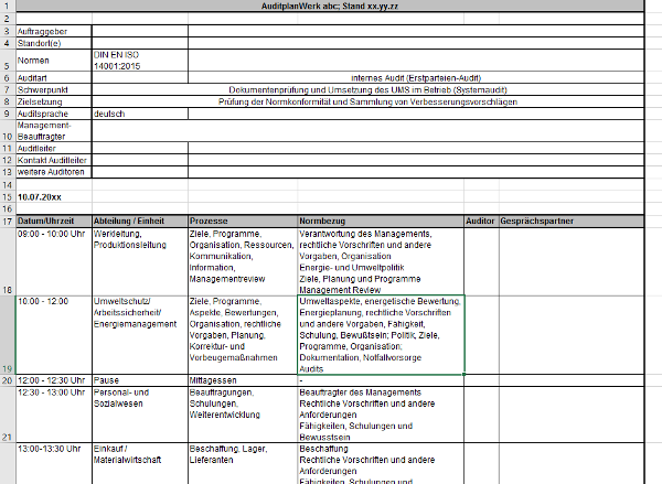 Grundlage für den Auditplan ist die oben beschriebene Bewertung der relevanten Punkte für das Umweltmanagementsystem. Mithilfe von Checklisten können die jeweiligen Verantwortlichen der Bereiche/Prozesse auditiert und die benötigen Nachweise dokumentiert werden.