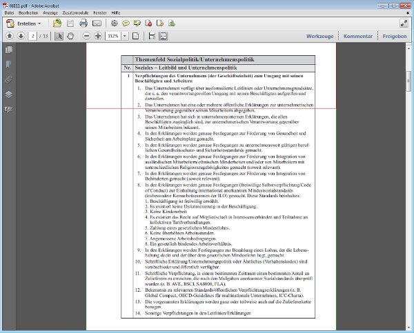 Der allgemeine Rahmen der Werte für die Evaluierung der sozial-ökologischen Verantwortung von Unternehmen soll anhand von Kriterien überprüft werden, die eine aussagekräftige, reproduzierbare und vergleichende Untersuchung und Bewertung von Unternehmen hinsichtlich ihrer tatsächlichen Verantwortungsübernahme in der Praxis möglich machen.